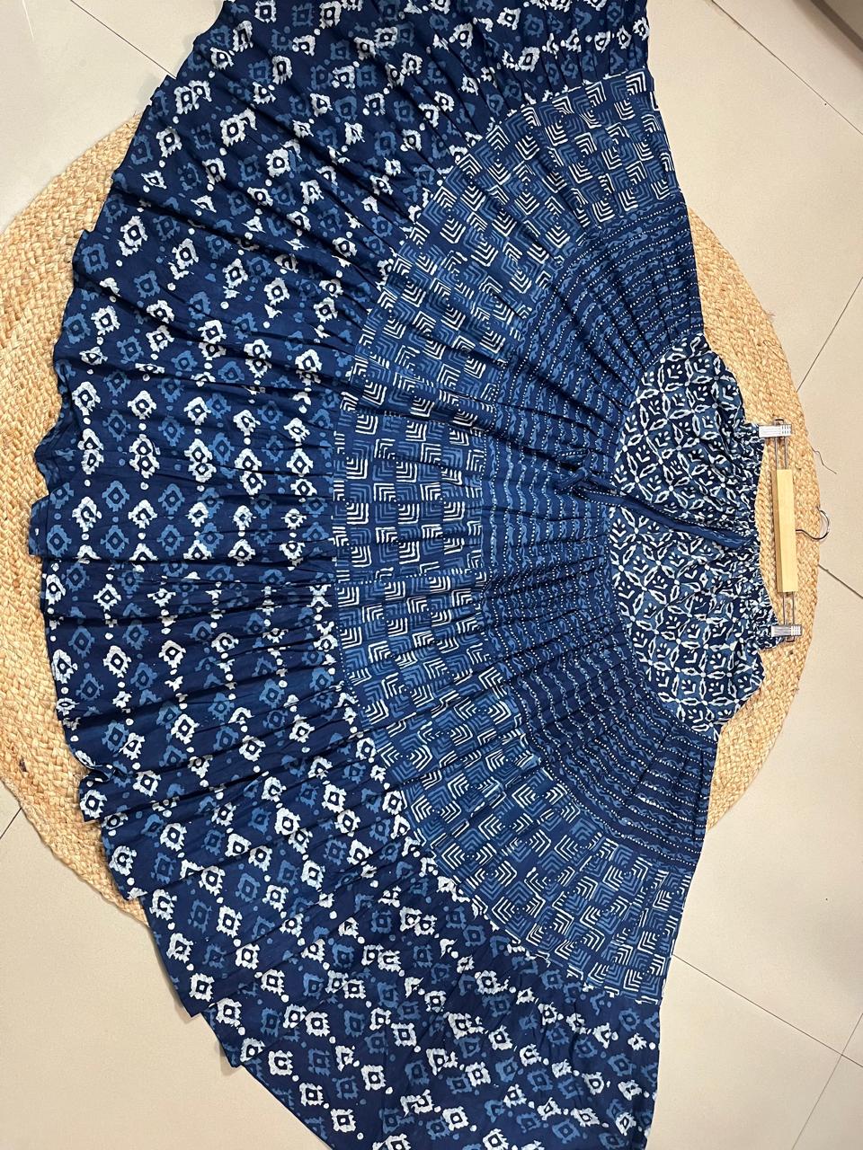 This Ajrakh rayon blue indigo skirt features traditional vegetable dyeing and a generous 8 meter flare, creating an elegant and flowing silhouette. Crafted with expert attention to detail, its rich maroon hue and intricate Ajrakh patterns make it a timeless piece that combines comfort with cultural artistry. Ideal for those seeking both style and heritage in their wardrobe.