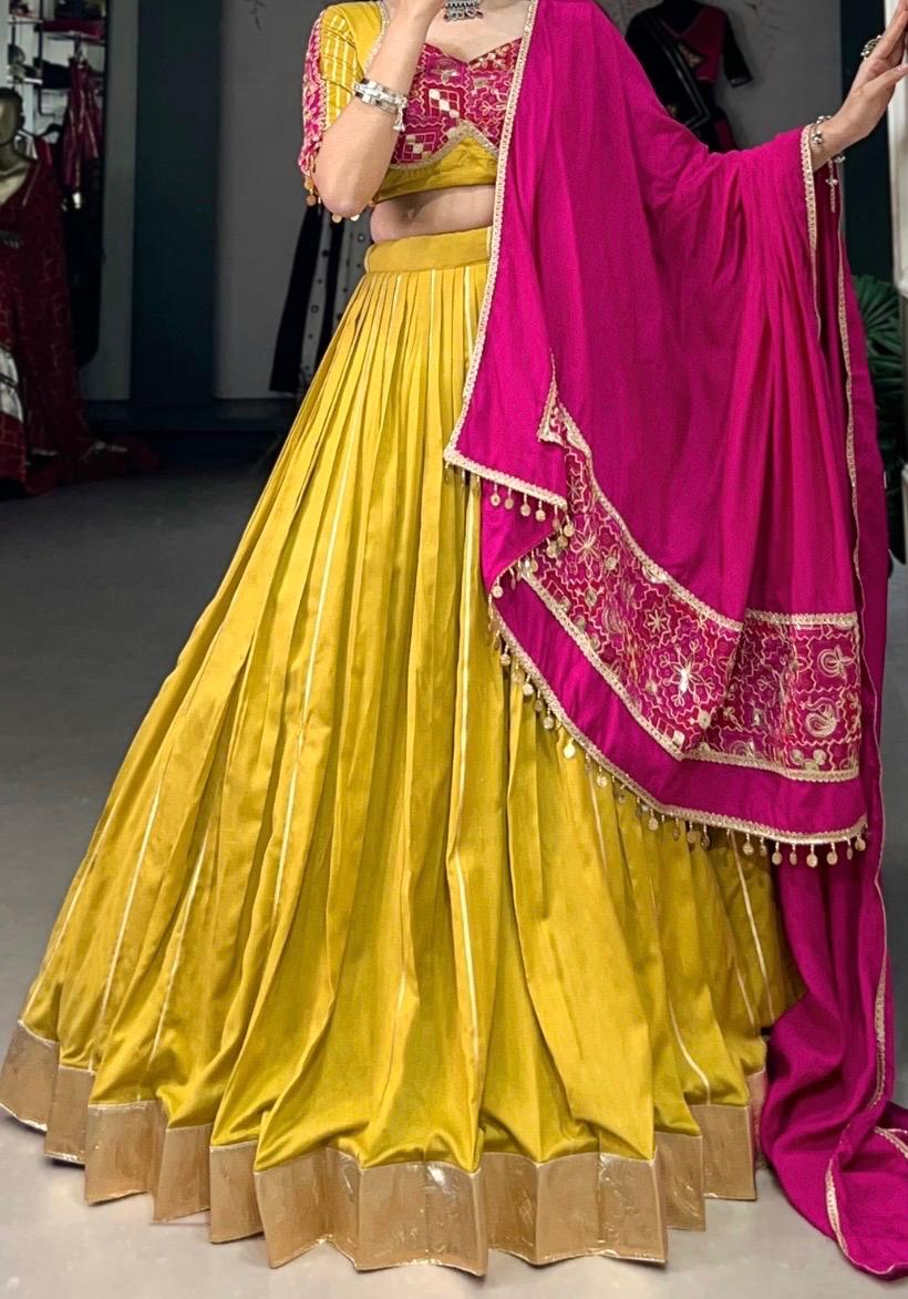 A mustard yellow and fuchsia ready to wear chanderi silk lehenga blends the elegance of traditional Indian fabric with modern, vibrant colors. Chanderi lehenga, known for its lightweight and glossy texture. It has zari line Gota Patti work , perfect for weddings and special events.