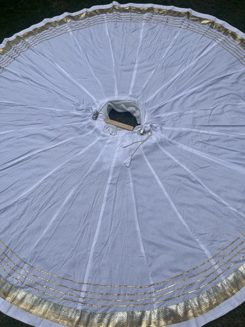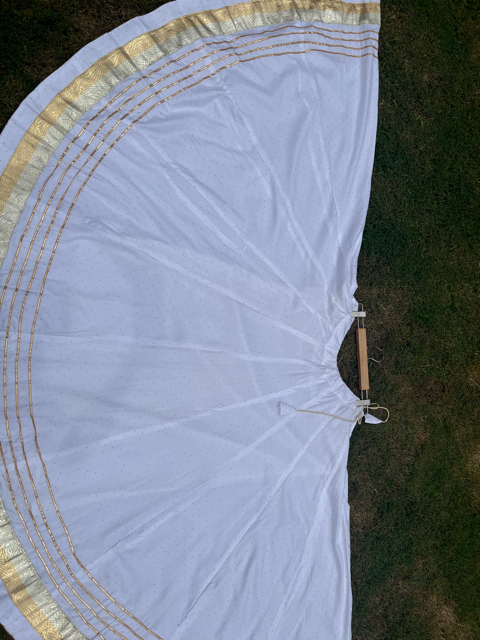 This exquisite white skirt features a full 8-meter flare, enhanced with a delicate lampi border and intricate Mukesh embroidery. The chandrakala border adds a refined touch, making it an ideal choice for festive occasions. Its generous flare creates a stunning silhouette, combining traditional craftsmanship with elegant design for a standout festive wardrobe piece.