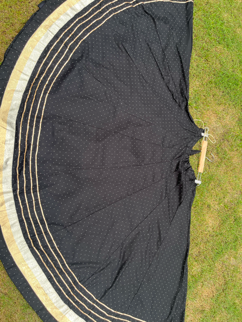 This exquisite black skirt features a full 8-meter flare, enhanced with a delicate lampi border and intricate Mukesh embroidery. The chandrakala border adds a refined touch, making it an ideal choice for festive occasions. Its generous flare creates a stunning silhouette, combining traditional craftsmanship with elegant design for a standout festive wardrobe piece.