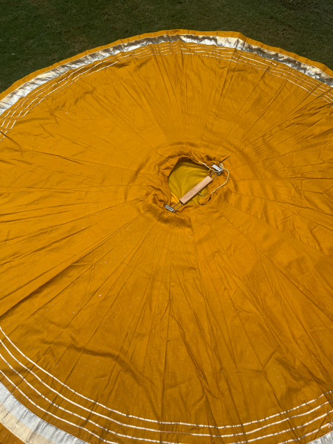 This exquisite mustard yellow skirt features a full 8-meter flare, enhanced with a delicate lampi border and intricate Mukesh embroidery. The chandrakala border adds a refined touch, making it an ideal choice for festive occasions. Its generous flare creates a stunning silhouette, combining traditional craftsmanship with elegant design for a standout festive wardrobe piece.