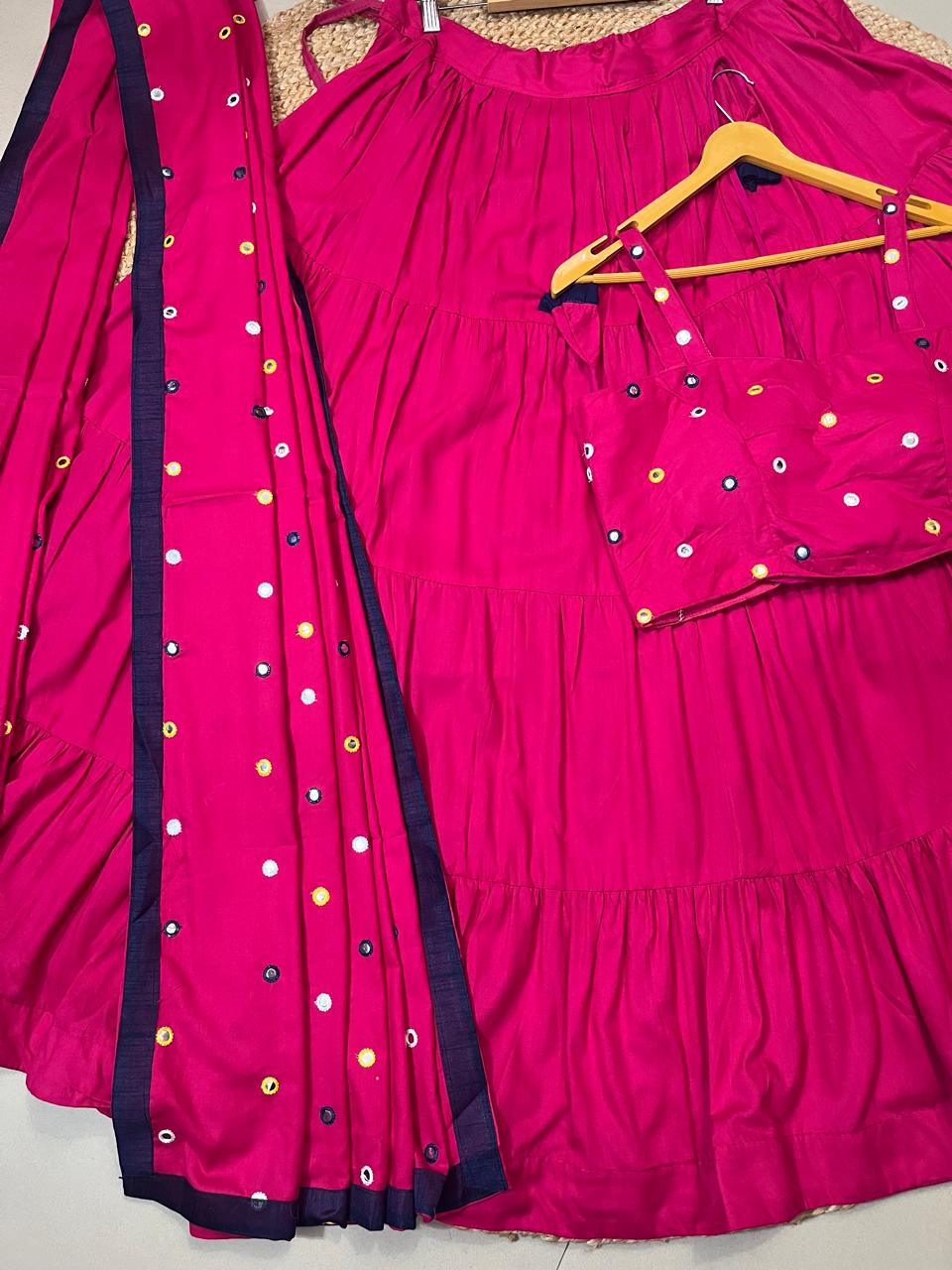 Elevate your festive wardrobe with the Fuchsia Rayon Pallavi Festive Lehenga Choli. Crafted from lightweight rayon, this skirt set features exquisite foil mirror work that adds a subtle shimmer, making it ideal for weddings and celebrations. Its easy-to-drape fabric ensures comfort and grace throughout your special occasions. Perfectly blending traditional artistry with modern wearability, this lehenga choli is a refined choice for festival elegance.