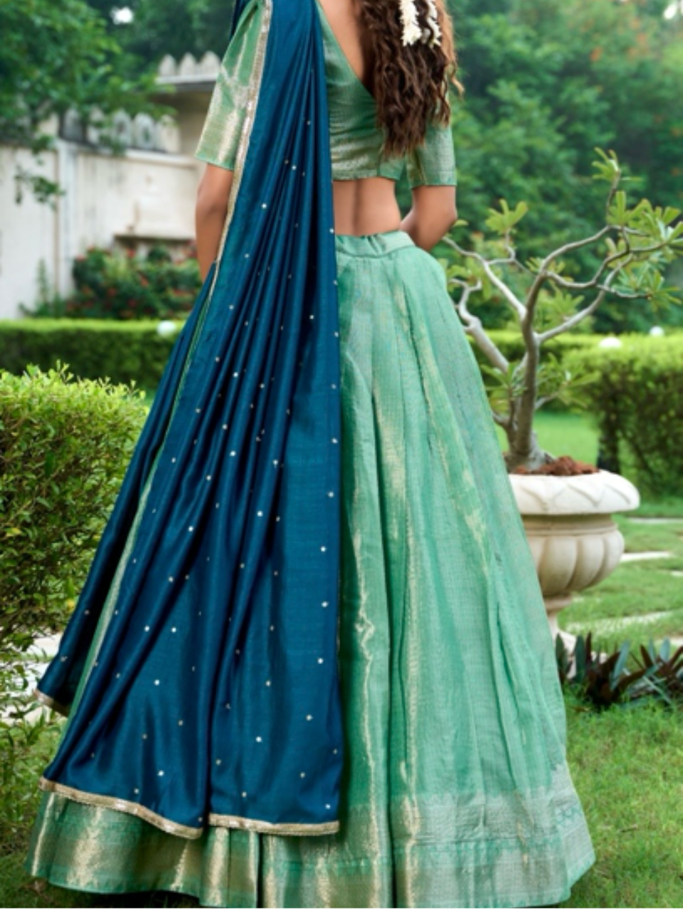 This exquisite Kanchipuram turquoise lehenga is a timeless blend of elegance and tradition. The lehenga comes with an unstitched blouse, allowing for customization to achieve a perfect fit and design. Complementing the ensemble is a dark maroon dupatta, creating a touch of finesse and sophistication.