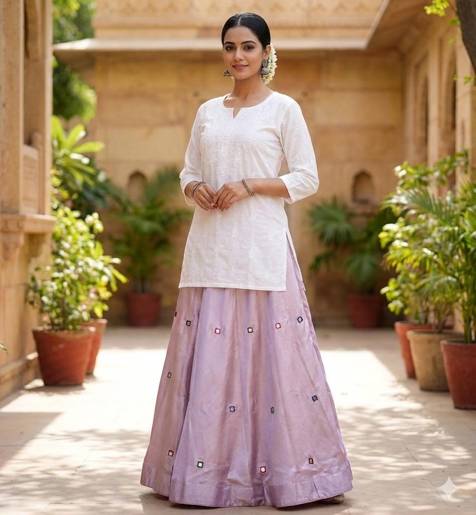 Mashru silk, a traditional Indian textile, brings timeless elegance to this handcrafted skirt. The fabric's inherent luminosity is enhanced by intricate mirror work, creating a mesmerizing interplay of light and reflection. Each piece reflects generations of artisanal expertise, combining the natural sheen of silk with meticulous embellishment. Perfect for those who appreciate authentic Indian craftsmanship and understated luxury, this skirt seamlessly transitions from festive occasions to refined everyday wear.