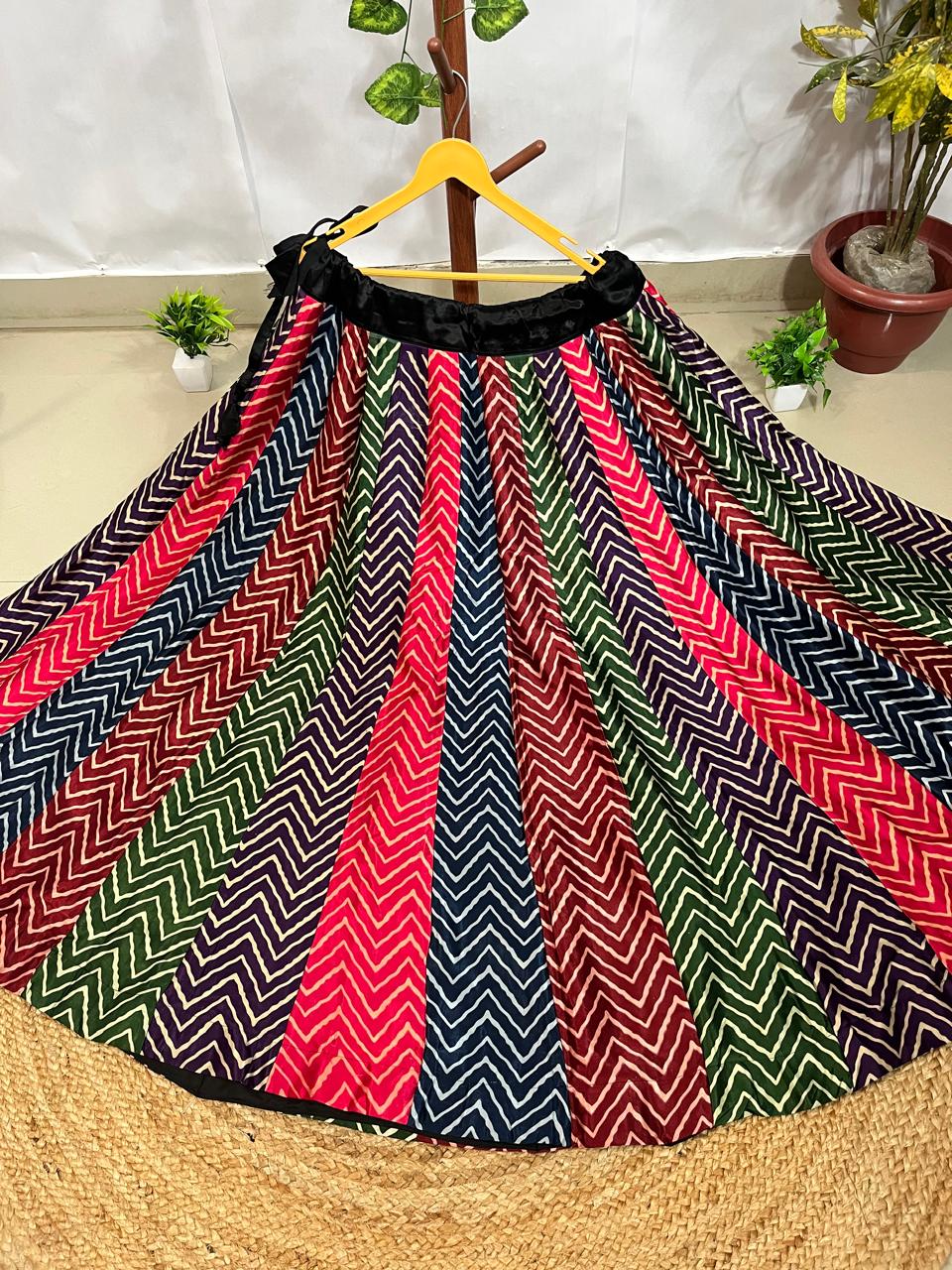 Crafted from authentic mashru silk, this Indian skirt showcases a striking zigzag pattern panel that commands attention. The multicolor palette blends traditional artistry with contemporary flair, making it versatile for both festive occasions and everyday elegance. Mashru's natural breathability and subtle sheen ensure comfort without compromising on sophistication. The structured panel design creates flattering silhouettes while honoring time-honored weaving techniques. Perfect for those seeking genuine handcrafted textiles with cultural significance and enduring style.